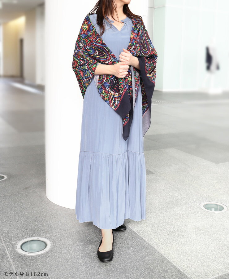 大判でハリのあるスカーフは、ストールとしてもボレロとしても使え、一枚バッグに入れておくととても便利な一枚です。